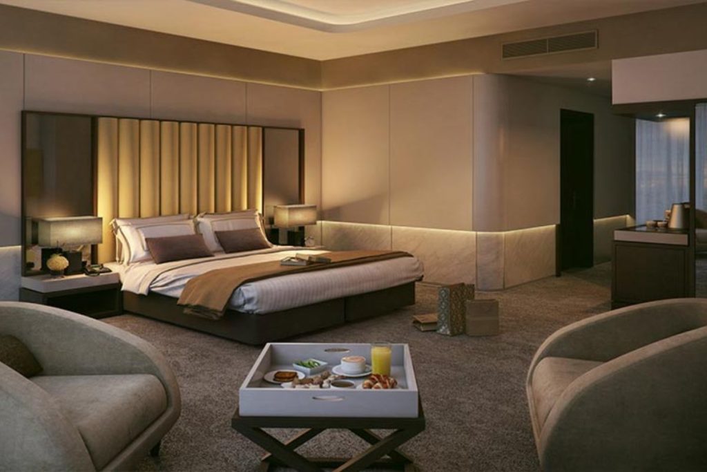 • Phòng ngủ (Guest Room): Bao gồm giường ngủ (thường là kích thước lớn), tủ đầu giường tích hợp ổ cắm/đèn, tủ quần áo, bàn làm việc, kệ TV, ghế bành (armchair) và băng ghế để hành lý.